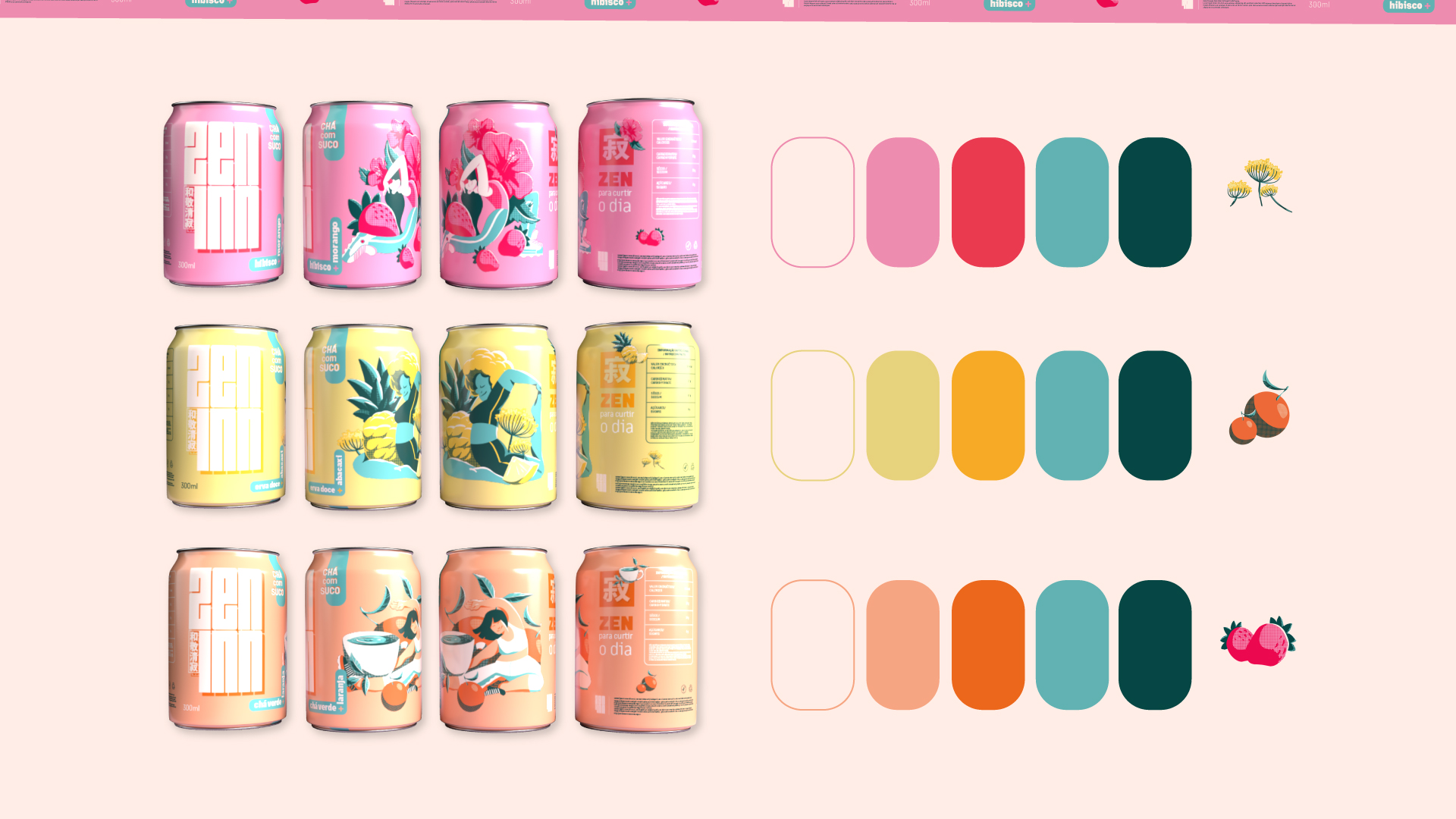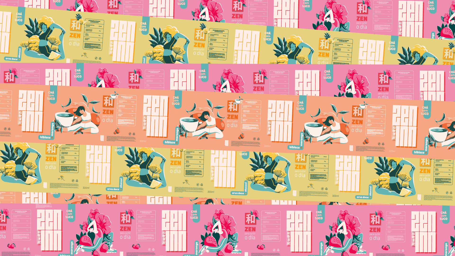A identidade visual da Zen'inn buscou integrar esses valores. No logotipo, os ideogramas correspondentes a 'Wa Kei Sei Jaku' foram posicionados na parte inferior esquerda, respeitando o sentido de leitura oriental. Em contraste com a tradição evocada pelos ideogramas, optou-se por uma fonte blocada, simbolizando a contemporaneidade da marca. As ilustrações originais, criadas pelo artista Matheus Deiró, trazem figuras em poses inspiradas no Yoga. A curadoria das poses priorizou o dinamismo, retratando os personagens em um estado de meditação ativa, mantendo a sensação de movimento.